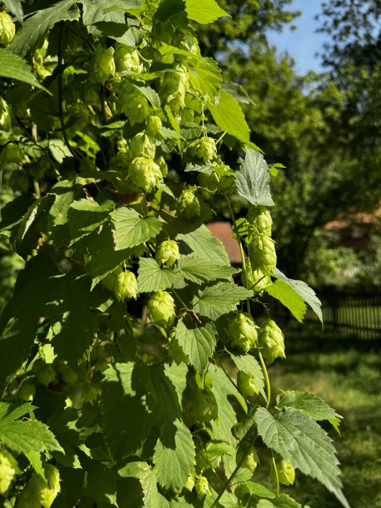 In diesem Jahr gedeiht der Nordbräu-Hopfen deutlich schneller als die Sorte Smaragd. Im letzten Jahr war es genau andersherum. Ob das am Wetter liegt oder an dem anderen Stand des Mondes, das habe ich noch nicht herausgefunden. Mal sehen, wie sich die Situation bei der Ernte darstellen wird. Sobald die beiden Maple-Ahornbäume, die eigentlich nur in Kanada gut wachsen, im Fürhherbst den Indian Summer der Nordheide einläuten, wird geerntet.